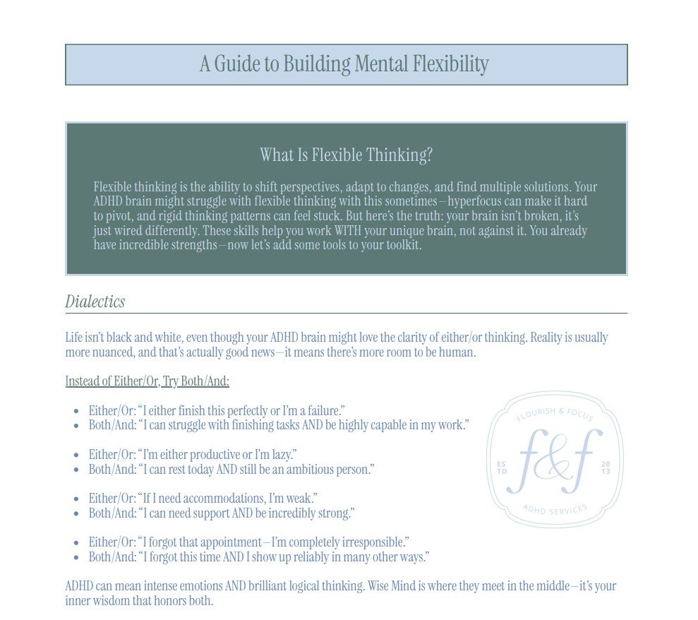 Welcome to the Flourish & Focus ADHD Toolkit — your collection of tools designed by Kate Vessels,LISW-S, who lives with ADHD. These free handouts are born from her own ADHD journey and years of working with women just like you.